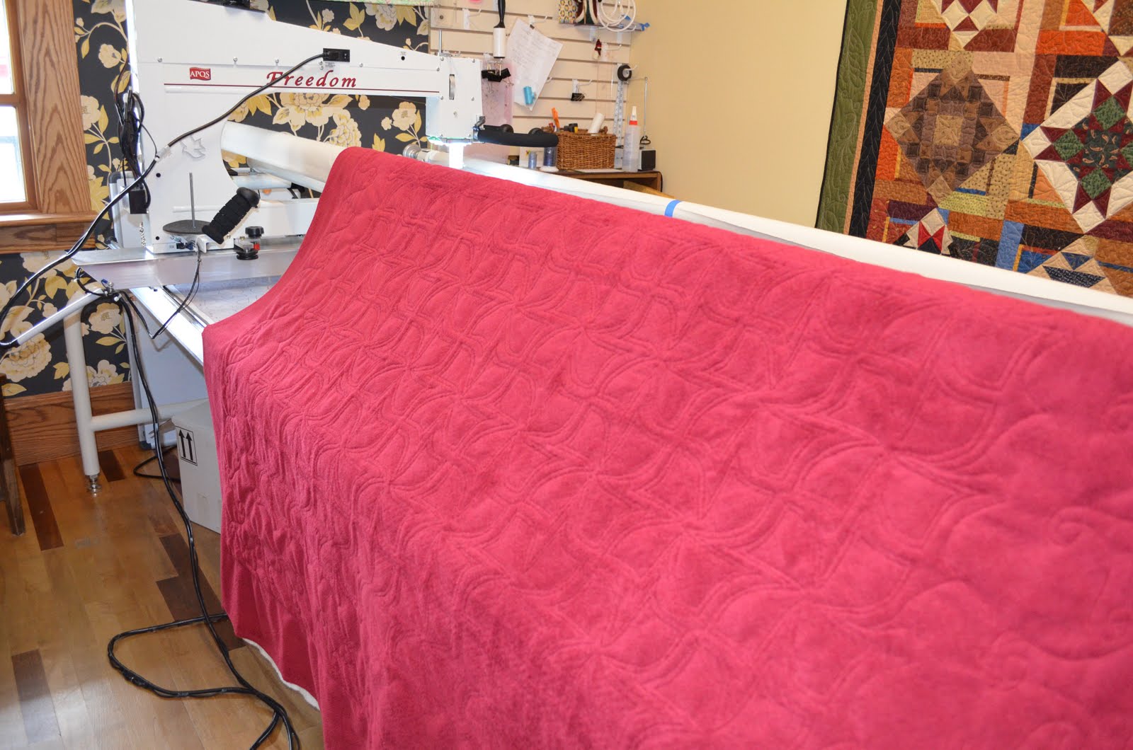 .... and then there was Freda's (not to be confused with Freeda) quilt. This is the first quilt Freda has made - and she went BIG! It's very busy - so I quilted it with Freehand teardrops just to give it some texture; Superior So Fine thread; wool batting - I love working with wool batting!